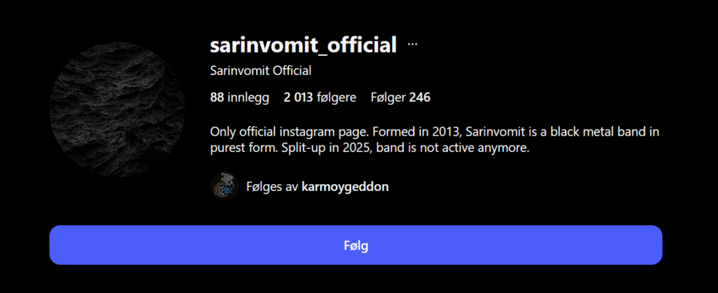 All Sarinvomit releases have been removed from major streaming services, including Spotify. Their Facebook page has disappeared, and their Instagram account has been set to private, displaying a short message in the bio: “Split-up in 2025, band is not active anymore.”
