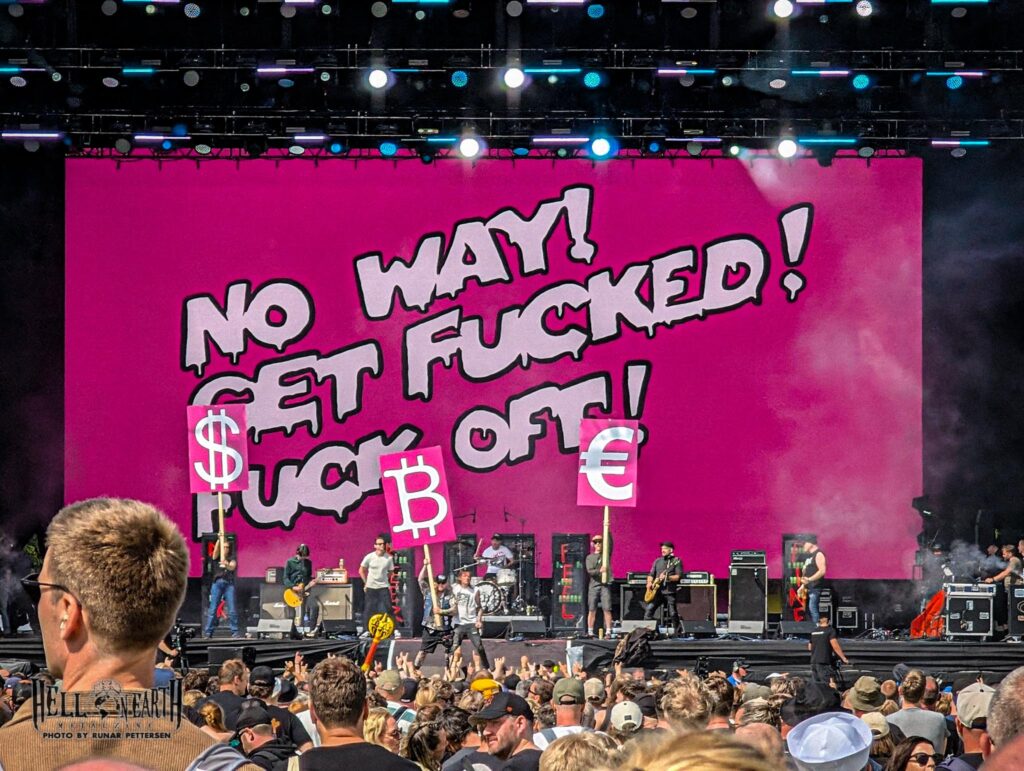 Turbonegro know how to create a party. We get that when they fire up “Rock n Roll Machine”. Songs like “City of Satan”, “Are You Ready (For Some Darkness)” and “All My Friends Are Dead” always spark sing-alongs. That said, I’ve seen them much better. Tony Sylvester seems a bit sluggish, shuffling down the catwalk on the main stage—maybe the sun has sapped his energy. Near the end a special guest is announced, and I’ll admit I expected someone more famous than Benjamin Berdous from Slomosa. Fame aside, he also seems a bit low-energy as he does his best with “Imorgen skal eg daue”. I have to be honest: it didn’t sound great. A better-known guest does show up for the closer “I Got Erection”: Party Boy from Jackass—Chris Pontius, if you prefer. Also a let-down. He just stands there in his tanga wiggling his bum. Odd to say, but he actually seems shy. Or at least very uncomfortable. Understandable, since he’s not singing—just standing there in tiny underwear smiling. A decent enough Turbonegro show, though far from their best.